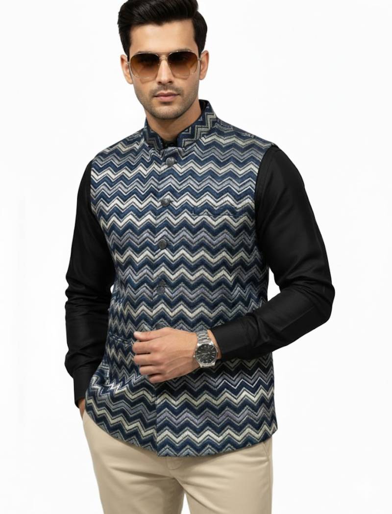 Navy Blue Chevron Zigzag Pattern Art Silk Nehru Jaket