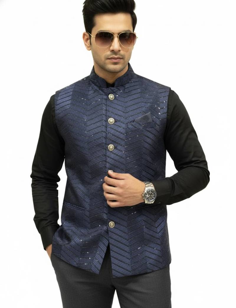 Navy Blue Sequin Embroidery Art Silk Nehru Jaket