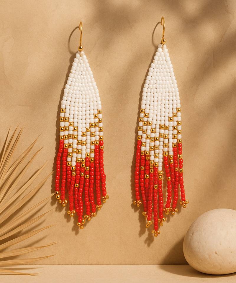 Jewelz Handmade White, Gold & Red Beaded Tassel Earrings